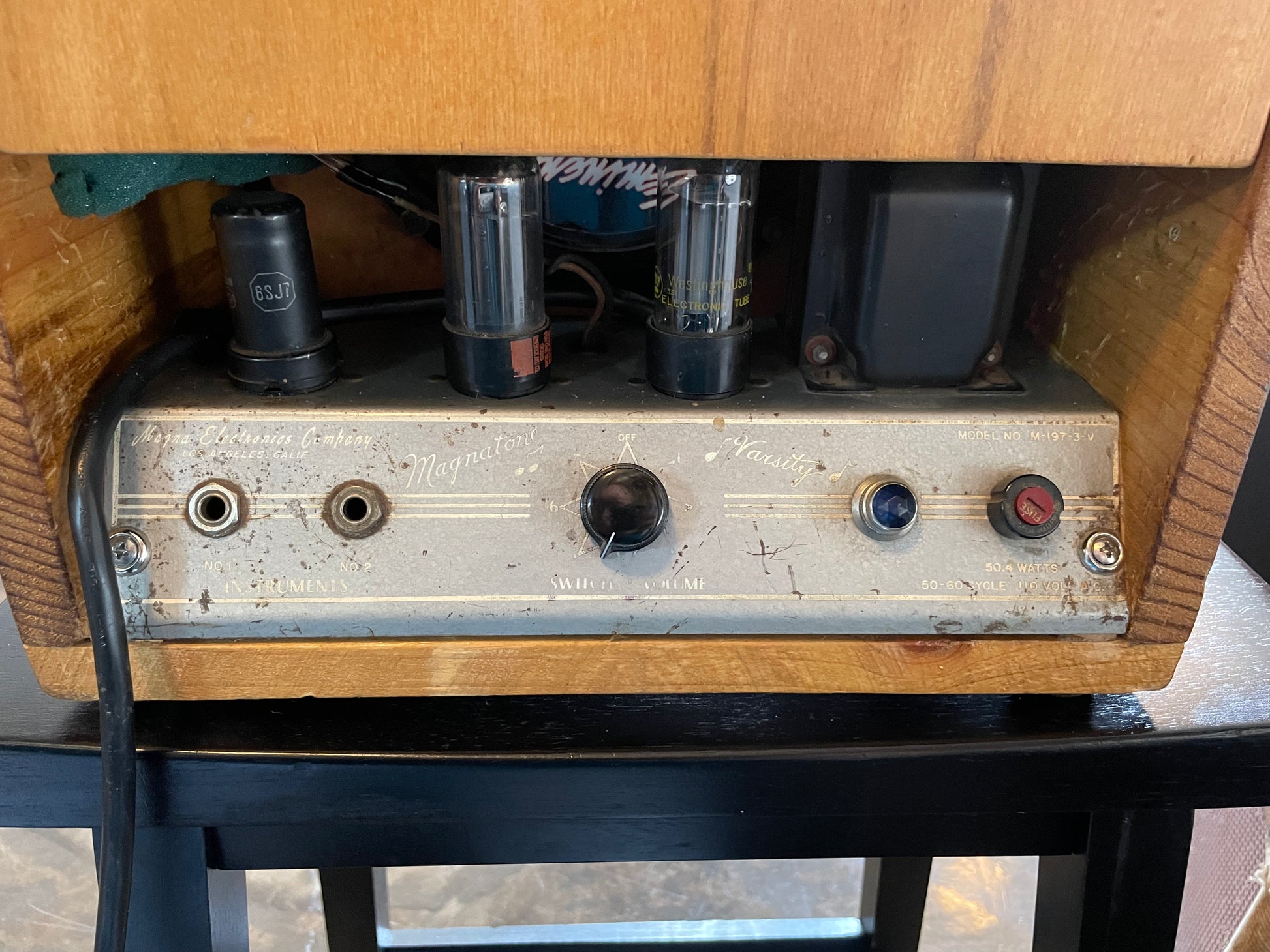 The original pieces in a new chassis; This amp was a competitor to the original Fender champs, and when you hear it you might wonder why these didn’t get as much attention. This amp was put into a new chassis mimicking the early boogie amps. But don’t be deceived, it’s a Magnatone. Sounds fantastic and is in great working condition.