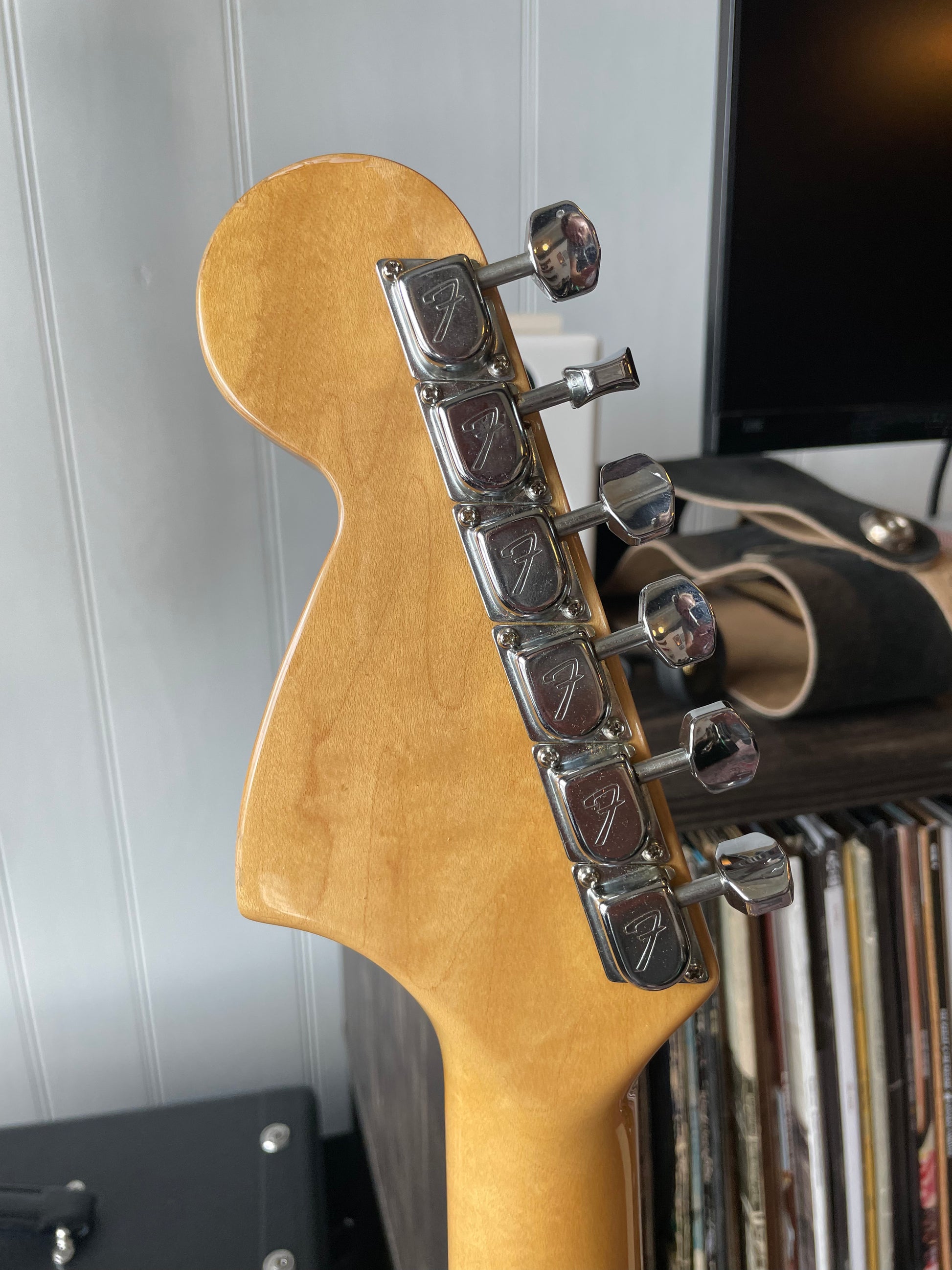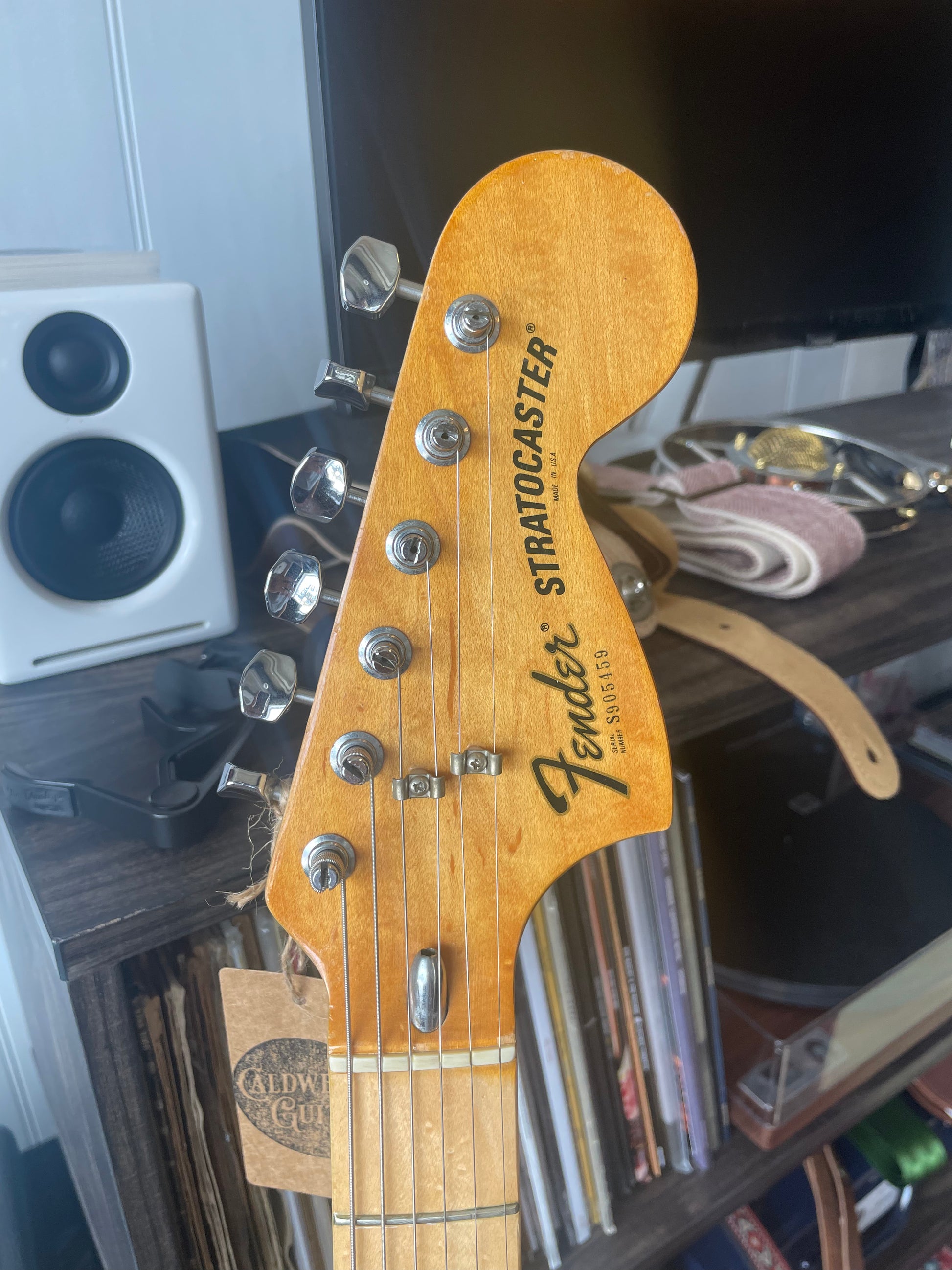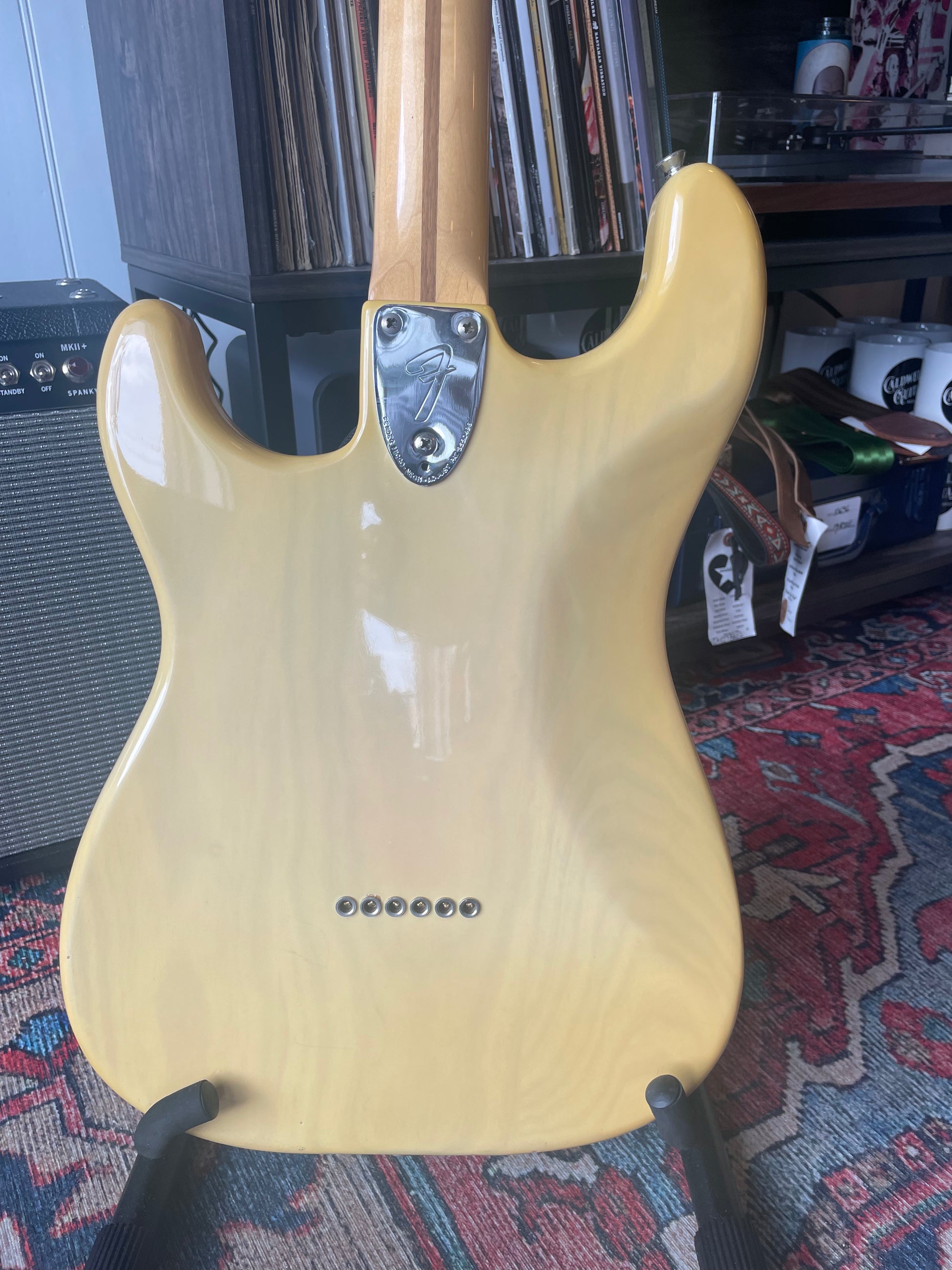 We have an awesome ‘79 Stratocaster in the shop. This vintage strat is all original from the pickups, the pink fabric in the case, and the ashtray on the hard tail bridge. Interestingly enough, the neck stamp reads ‘69 but the pickups read ‘68, meaning they were left over from the year before, providing even older tone! Setup, playing and sounding wonderful. Comes with the OHSC.