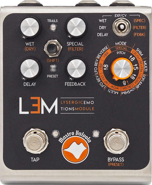 The LEM is a multi-head delay pedal with 8 effect modes, designed to inspire dreamy and experimental ambiances. While playing with this effect, it's easy to run into unique, hypnotic or unexpected sound environments like shimmering repeats, reverse delays, multi-head modulations, pitch shifting, lo-fi sounds and more.