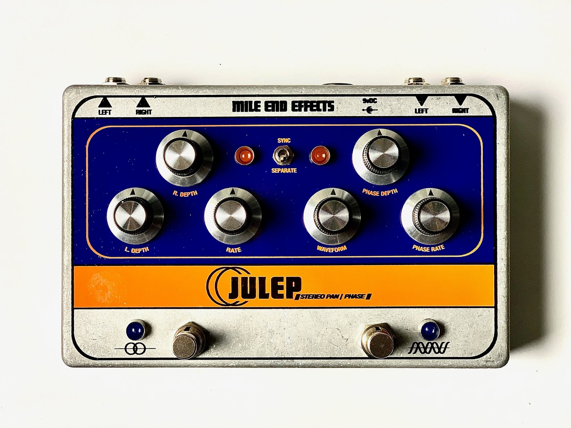 From syrupy, frothy vibe effects to dizzying, choppy stutters, the Mile End Effects Julep is by concept a semblance of the infamous Ibanez FP-777 Flying Pan, but functionally and electronically is an expansion and improvement on the idea. This optical stereo panning/tremolo and phasing effect gives a wide variety of sounds with variable waveform sculpting, independent depth controls for both left and right channels, a vast sweep in panning/tremolo rate from a slow crawl to a worried tremble and a subtle, vintage voiced phaser that at certain depth settings will take you into rotary simulation/uni-vibe territories and viscous swirls saved only for the finest lysergic experiences (...or for a cold, refreshing orange juice beverage with an egg mixed in...).