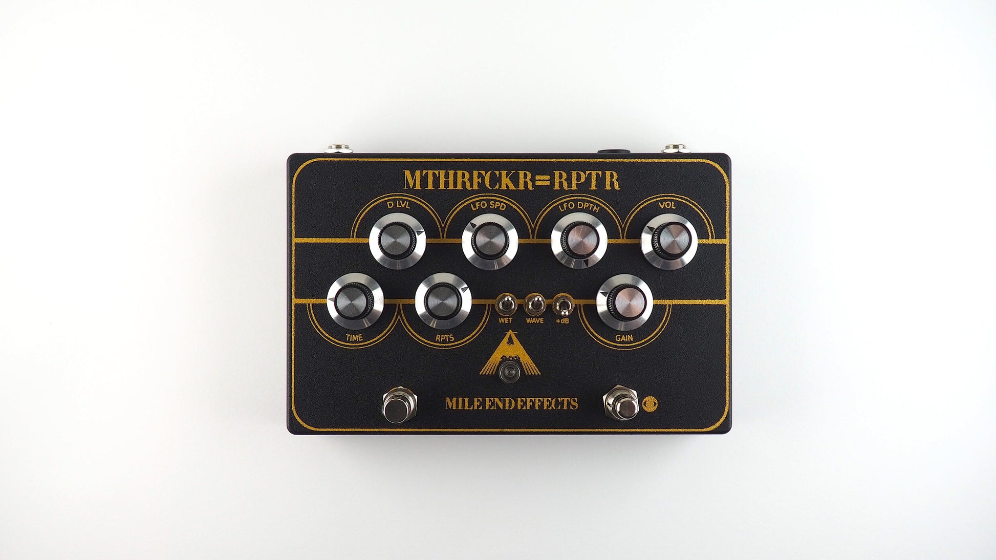 This pedal is where I finally landed after years of appreciating and collecting malfunctioning tape machines, trying to find units with JUST the right amount of low fidelity wobble, hiss and saturation (usually right before the machine becomes entirely unusable). The mthrfckr=rptr is at its core a delay pedal aimed at capturing the beautifully haunted artifacts found in poor quality or degraded magnetic tape and dedicated to the unstable mechanical nuances of a malfunctioning capstan motor. Random, non-cyclical LFO modulation is what mimics the very inconsistent modulation of physical tape being pushed across magnetic tape heads by a DC motor. In addition, a switchable PreAmp circuit allows you to drive the mthrfckr=rptr into a fizzy, blown-out, tape saturated overdrive. I have been heavily inspired by this sound and my hope is to inspire others who have been moved by the sound of these old malfunctioning tape machines and offer the tools to recreate it without having to stumble upon the small window of opportunity somewhere between functionality and ruination.