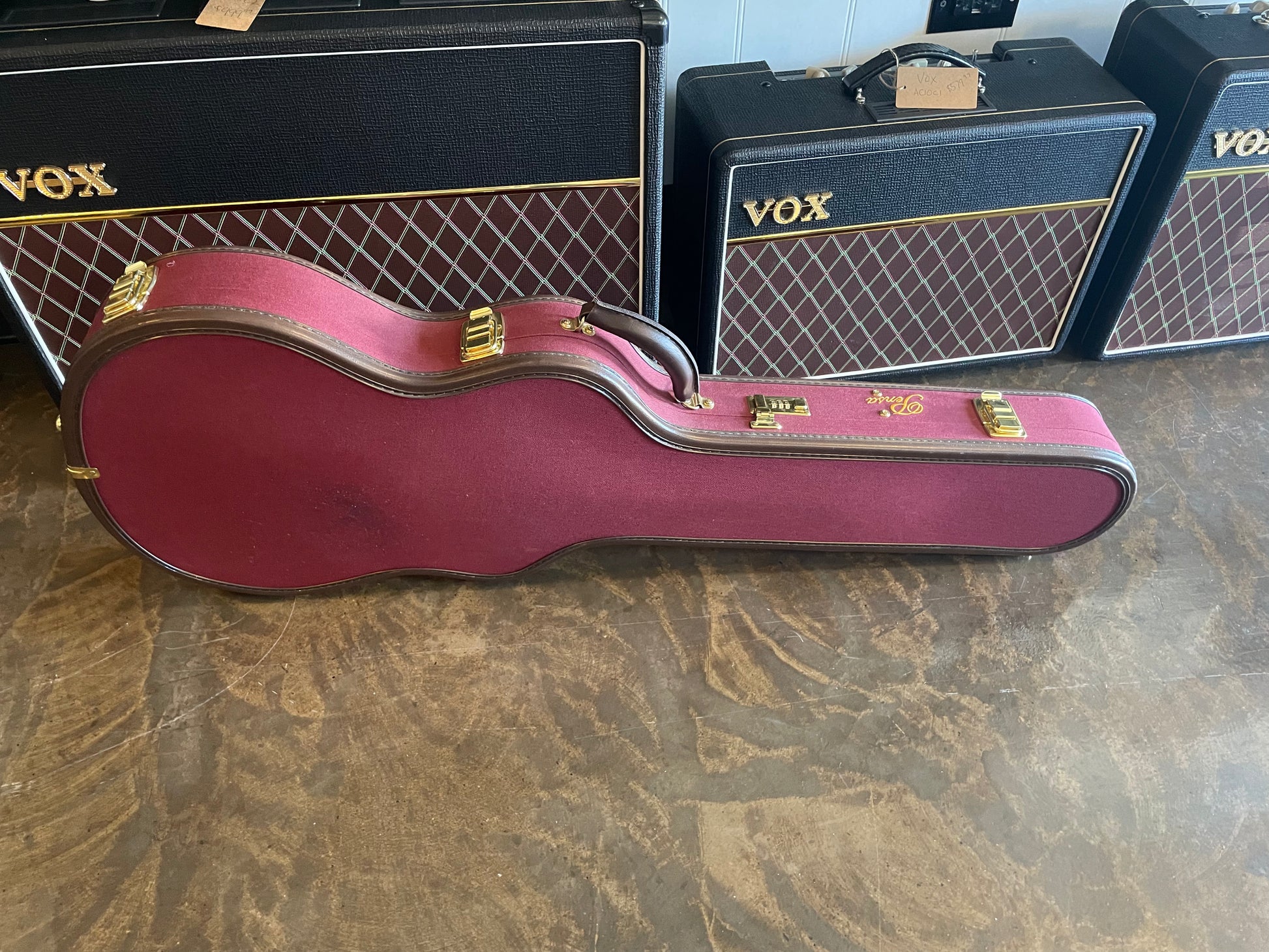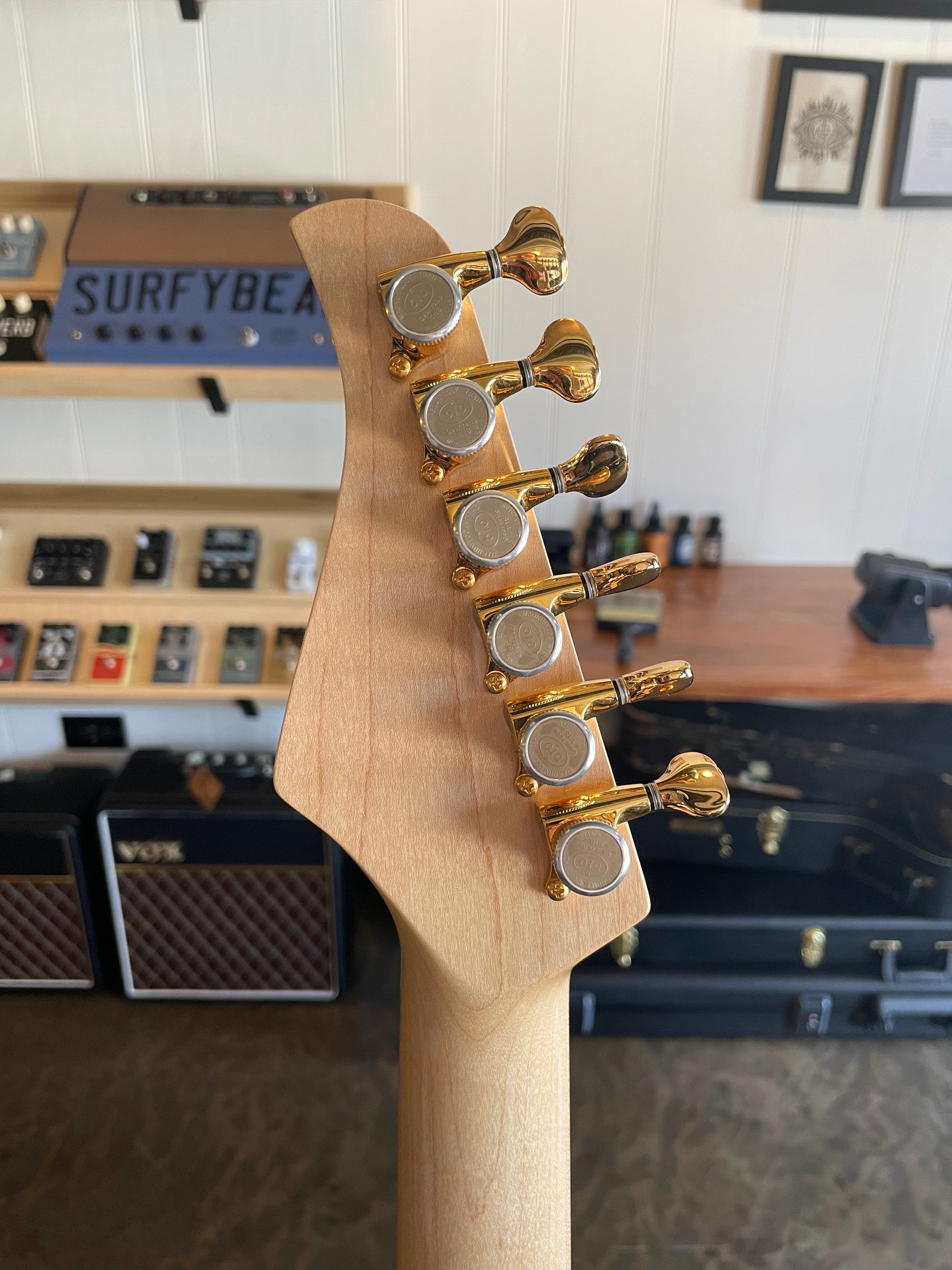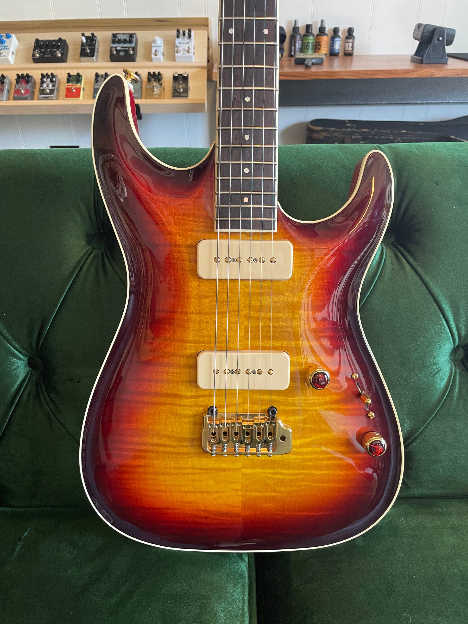 The original MK-90 was built in late 2011, and is essentially a version of the MK-1 with a non-premium top wood. This MK-90, however, has a beautiful flamed alder top and alder body. It carries Lindy Fralin Soapbar P-90 pickups and a Hipshot Tremolo bridge. The tone knob can be pulled out to engage the pickups to a partial series setting in any position. The MK-90 plays and sounds as magnificent as any Pensa MK, but with the joyous tone of the P-90.