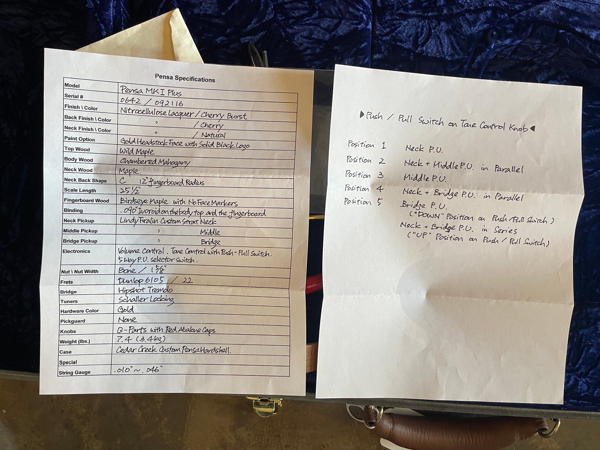 The MK-I Plus is a five way, three single coil, strat style take on the MK-I. With Lindy Fralin Stratocaster pickups, a tone knob partial series switch, and all the right Pensa appointments. This guitar catch’s your ears, fingers and eyes. The craft of electric guitar building is peaked with an instrument like this. This used MK-I is in fantastic condition with minor signs of wear. Setup ready to play and comes with the OHSC.