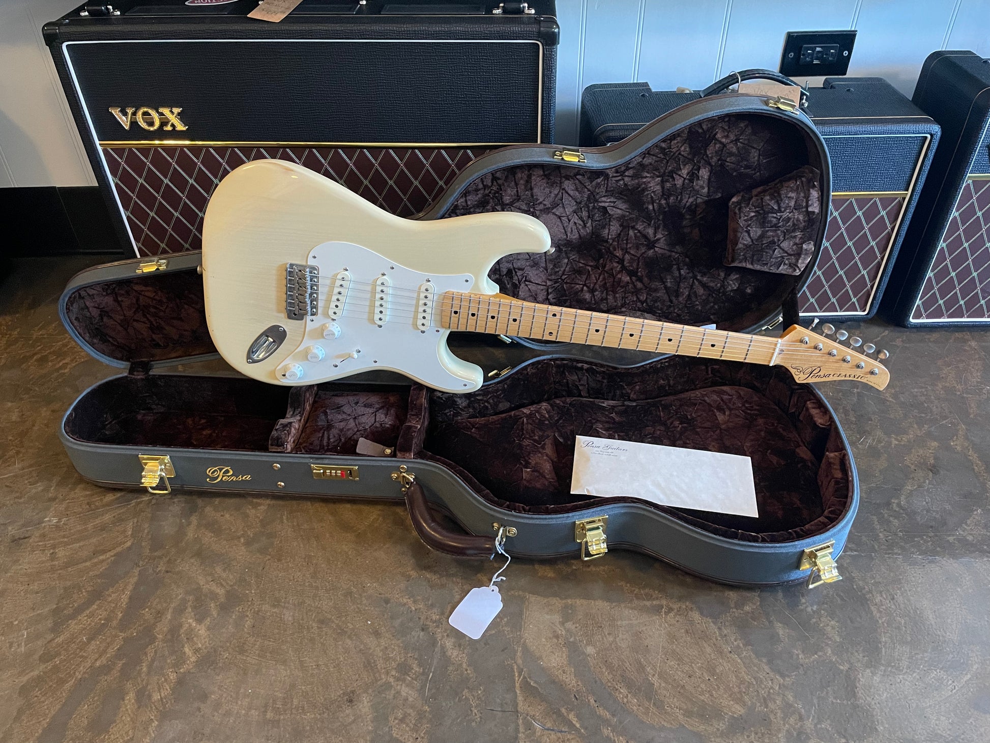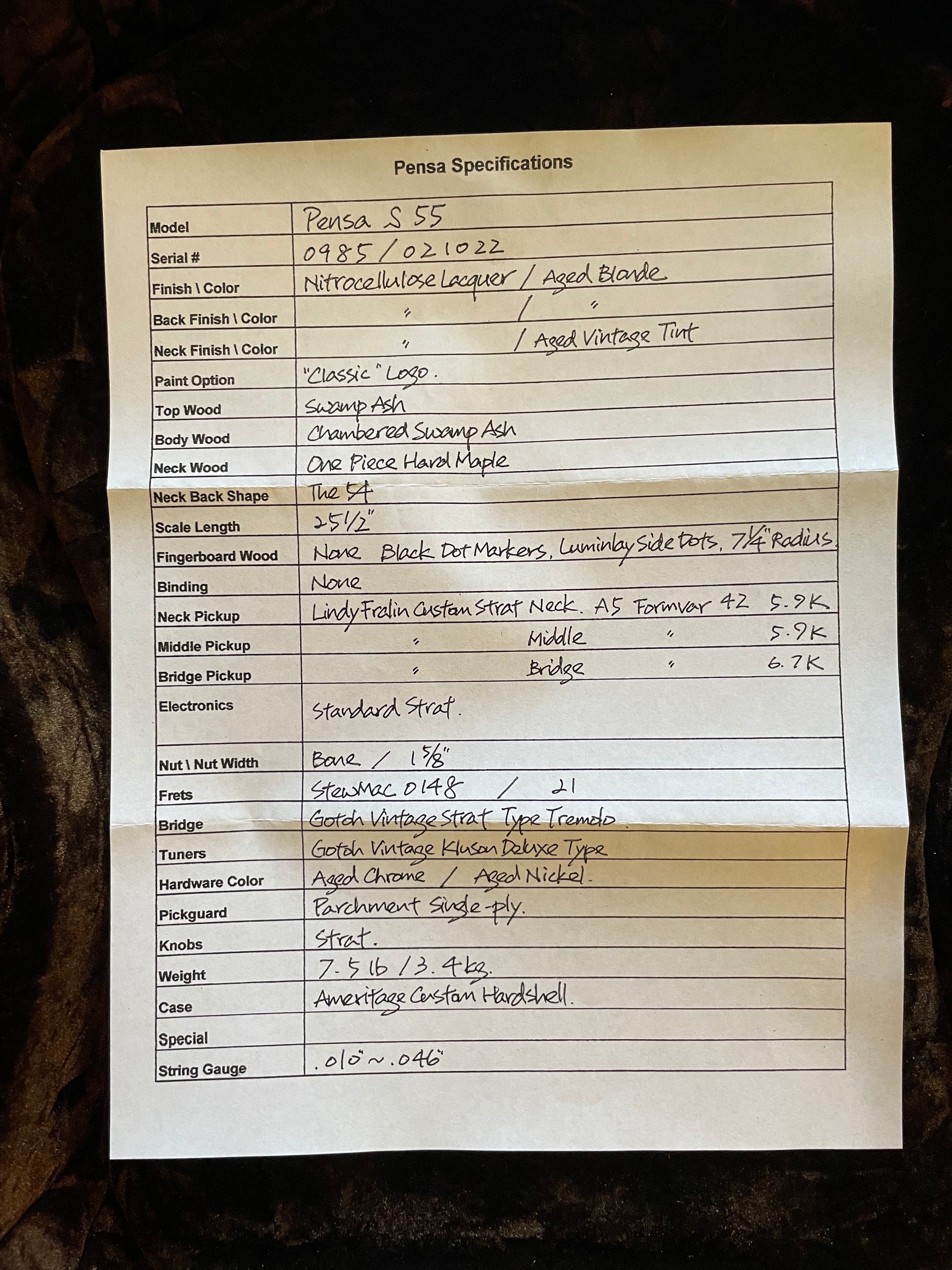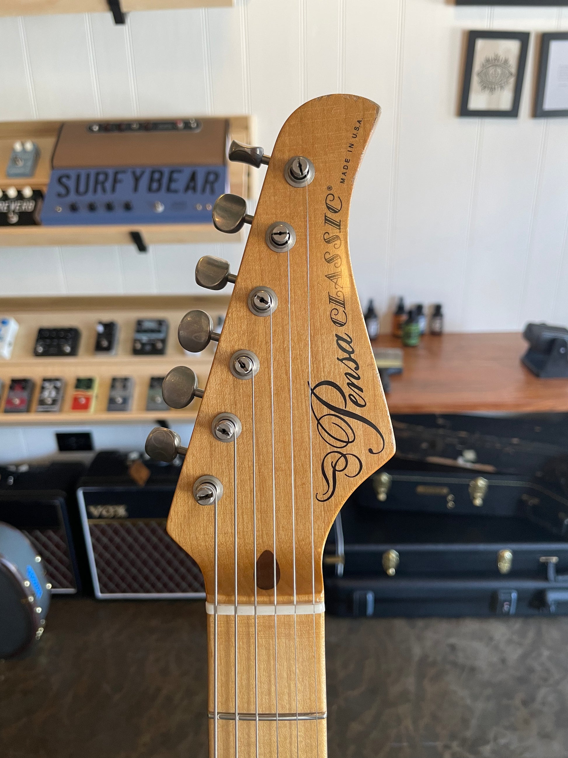 The S 55 is a classic fifties style Stratocaster with the superb quality and standard of a Pensa Custom. This guitar sounds like the best Stratocasters we know with a playability beyond most guitars. Lindy Fralin Pickups and Gotoh hardware tie the amazing details of this strat together to create an instrument that will never dissapoint.