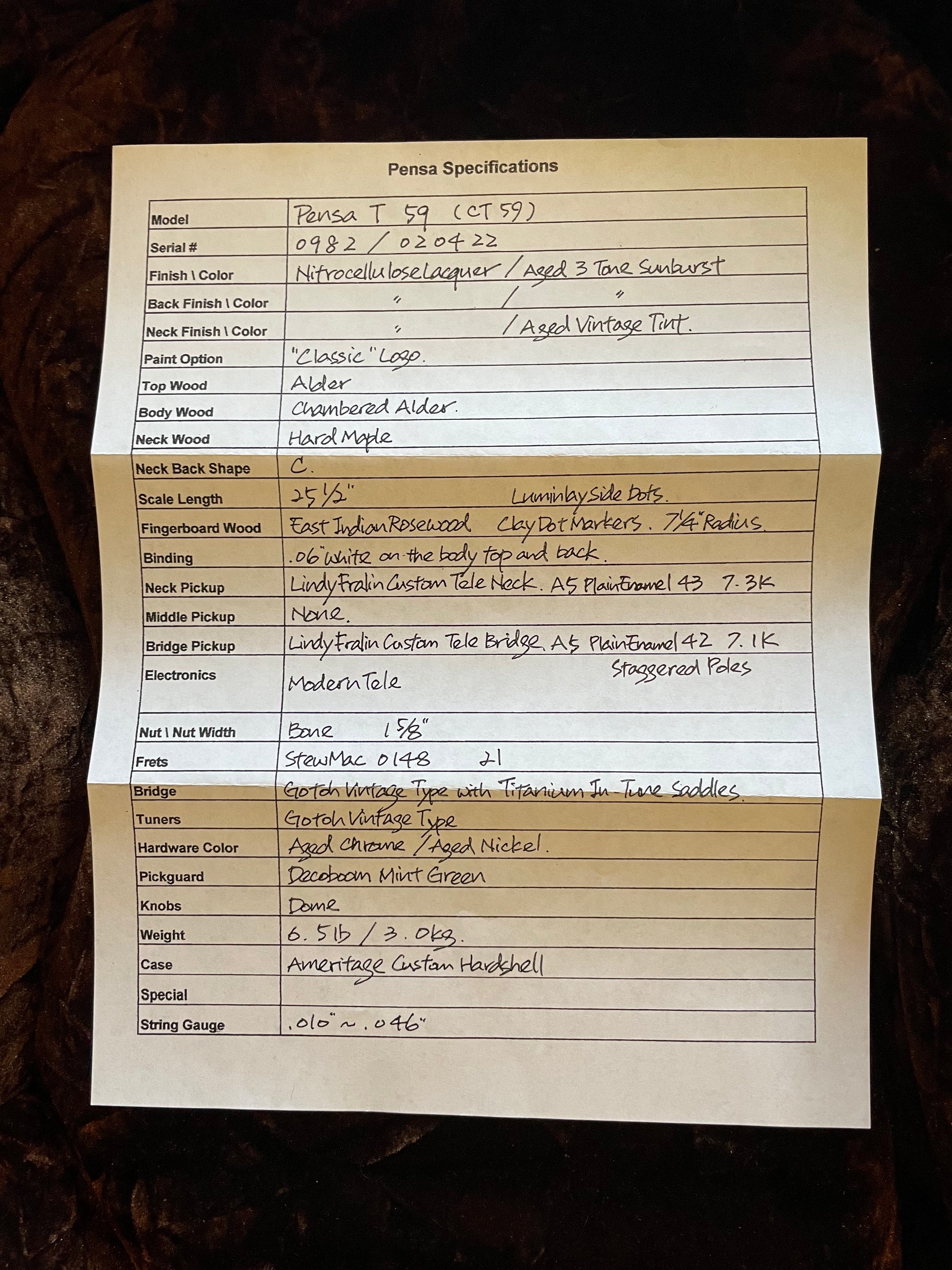 The T 59 is Pensa’s homage to the Fender Telecaster with all the greatest appointments such as custom Lindy Fralin Tele pickups and a Gotoh Vintage Type bridge with titanium in-tune saddles. With a fantastic relic job, this guitar is everything a player would hope for in a telecaster and far beyond. This type of telecaster takes your understanding of the instrument back to its roots and beyond. With Pensa’s artisan crafted neck and fingerboard, this guitar is sure to be a first grab for many players for a long time.