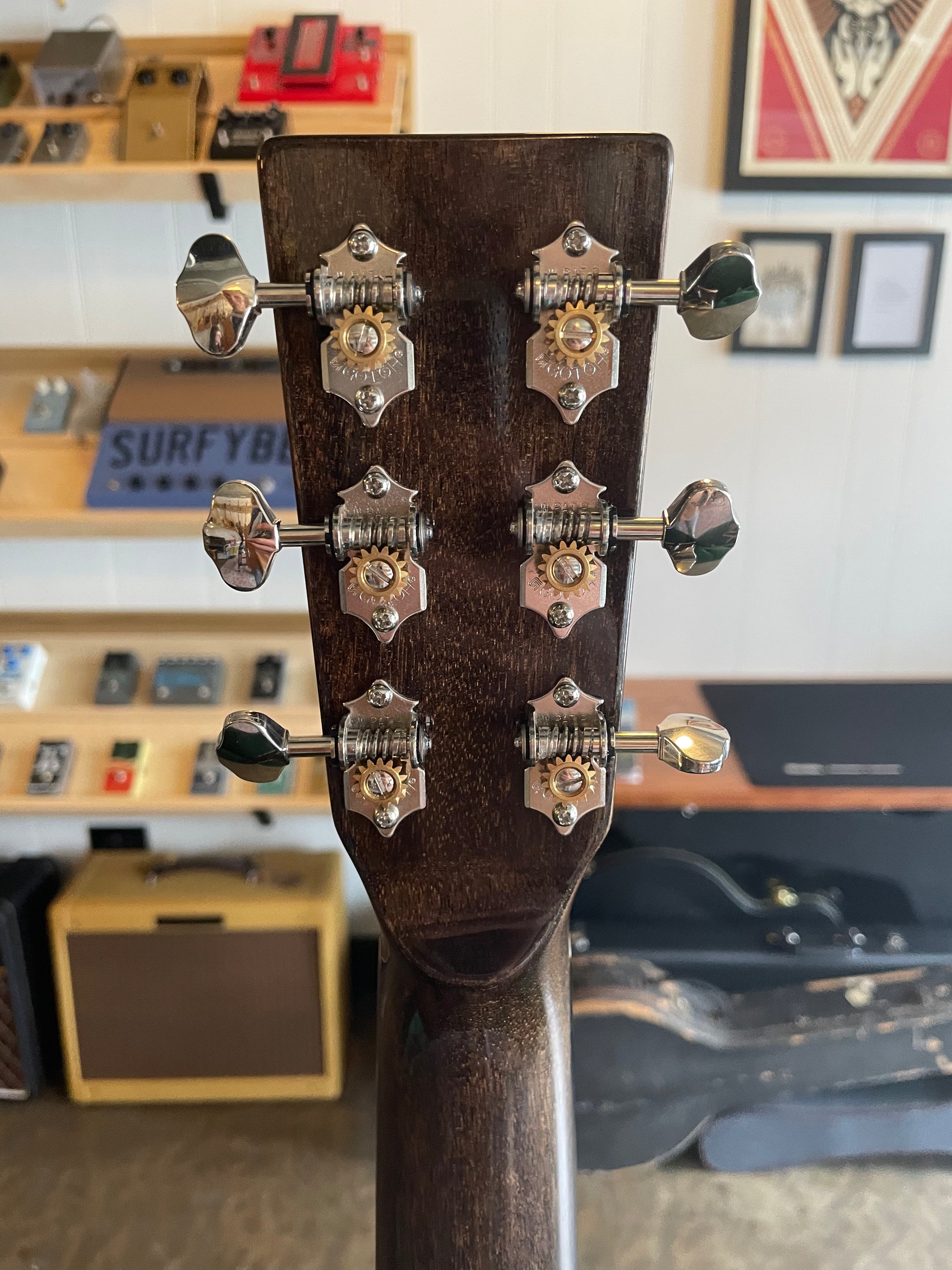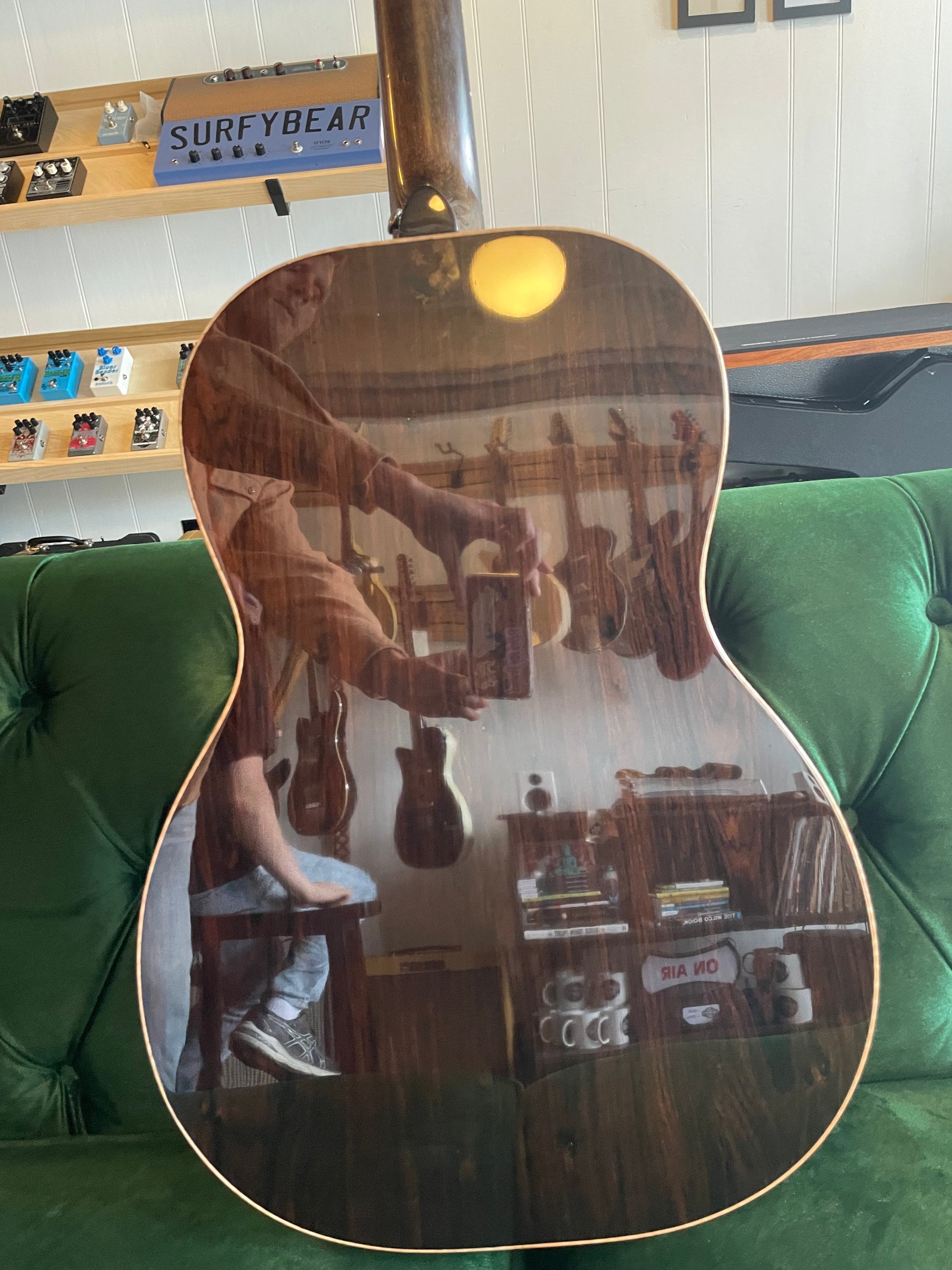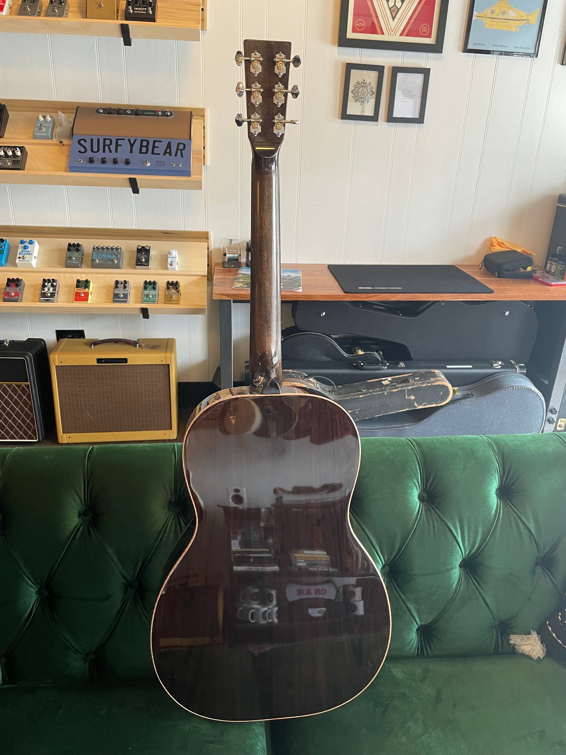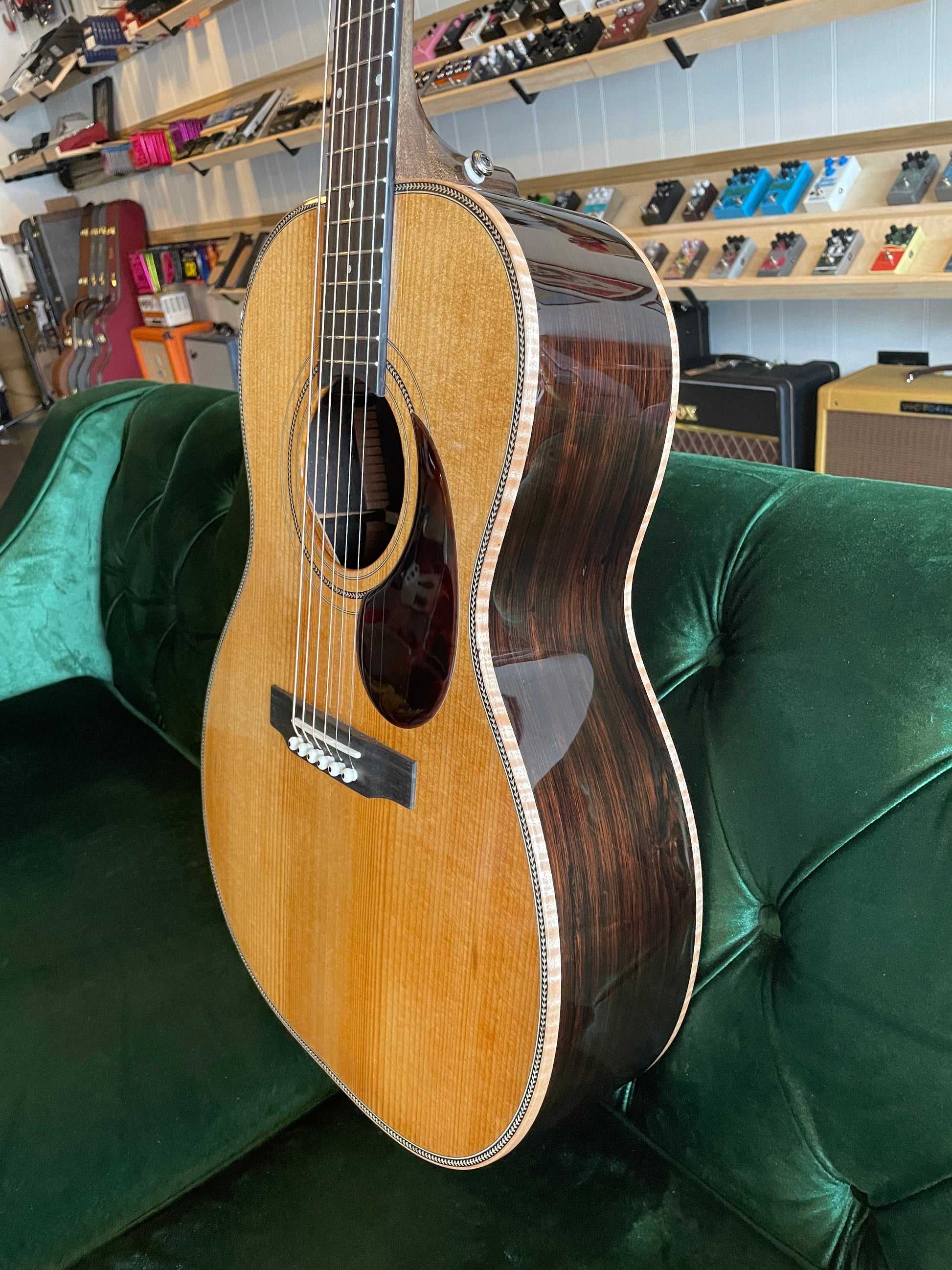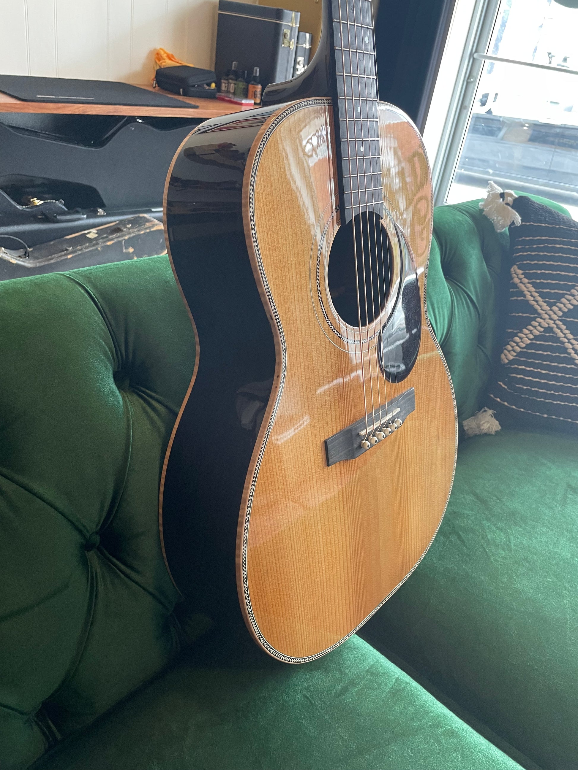 This 000 sports African Blackwood back and sides and a Gorgeous West Virginia, Torrified, Red Spruce top. Together they create a distinct and clear low end with a chipper high pronunciation. This 000 is as wide as a 00 at the lower bout, but has a longer body to make up for the loss in space. Curly Maple binding and Herringbone inlays for gorgeous detail. 1 3/4” compensated bone nut for perfect intonation with a bone saddle and pins. The bolt-on neck also features a semi gloss finish for easier playability across the neck. This guitar is well pronounced in tone for it’s size and produces more low end than you would expect. Fun and easy to play, sure to satisfy. Comes with a HSC.