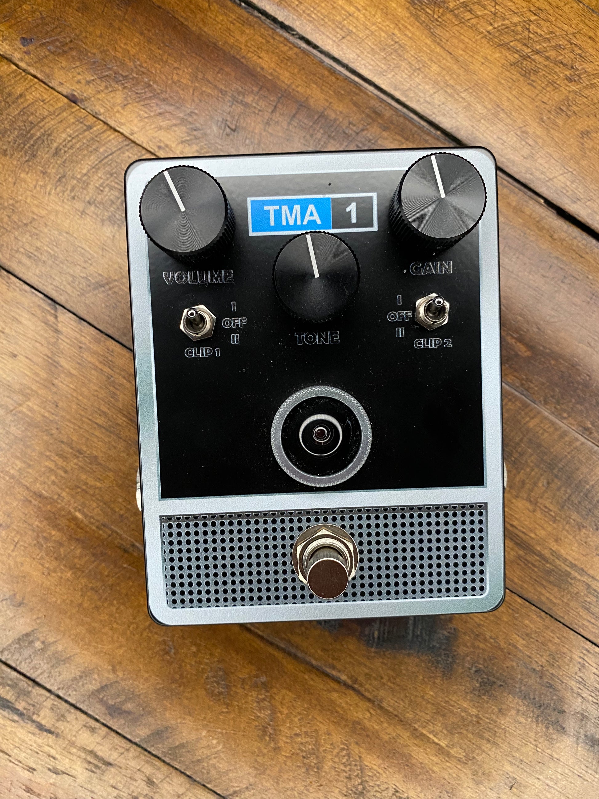 Detected by its strong magnetic field emanating from the lunar crater Tycho, the TMA-1 was found buried 15 meters beneath the surface of the moon. The moment 9 volts of direct current hit the TMA-1, a powerful signal burst across the universe, searching for other devices of its kind. This is how the new fuzz pedal from Acorn Amplifiers came to be. The TMA-1 fuzz is a four stage transistor fuzz featuring a series of selectable diode clipping options. Germanium diodes, silicon diodes, and a bypass of the clipping diodes are switchable in two separate stages of the fuzz circuit, allowing for a vast array of shapable fuzz tones. A giant glass lens indicator glows red on the face of the pedal to remind humans of the impending singularity that threatens to doom mankind, and also to let you know when the fuzz is engaged. True bypass, powered by standard 9V tip-negative pedal power, 360 grams.
