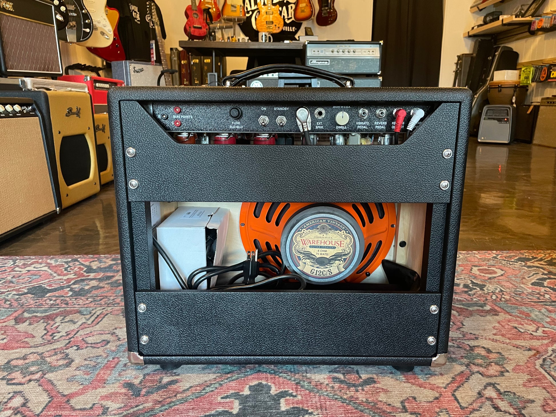 All Vintage Sound Amps are point-to-point hand-wired. Our cabinets are custom built for us and are built with high quality pine. We use top quality filter caps and electrolytics, carbon comp resistors, high quality tone caps, solid core pushback wire, and custom hand wound transformers Made in the USA. Amplifiers come with your choice of Warehouse (WGS) or Weber speakers–all Made In USA. We use top quality tubes by Tube Amp Doctor (TAD), (Other High Quality tubes may be substituted, either Mullard or Tung-Sol). All amps come with a five-year limited warranty to the original owner and include a signed and dated tube chart on the inside of the cabinet.